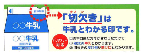 バリアフリー対応容器として、目の不自由な方が、牛乳と他の飲料を区別でき、また切欠きの付いている反対側が空け口とわかるものです。